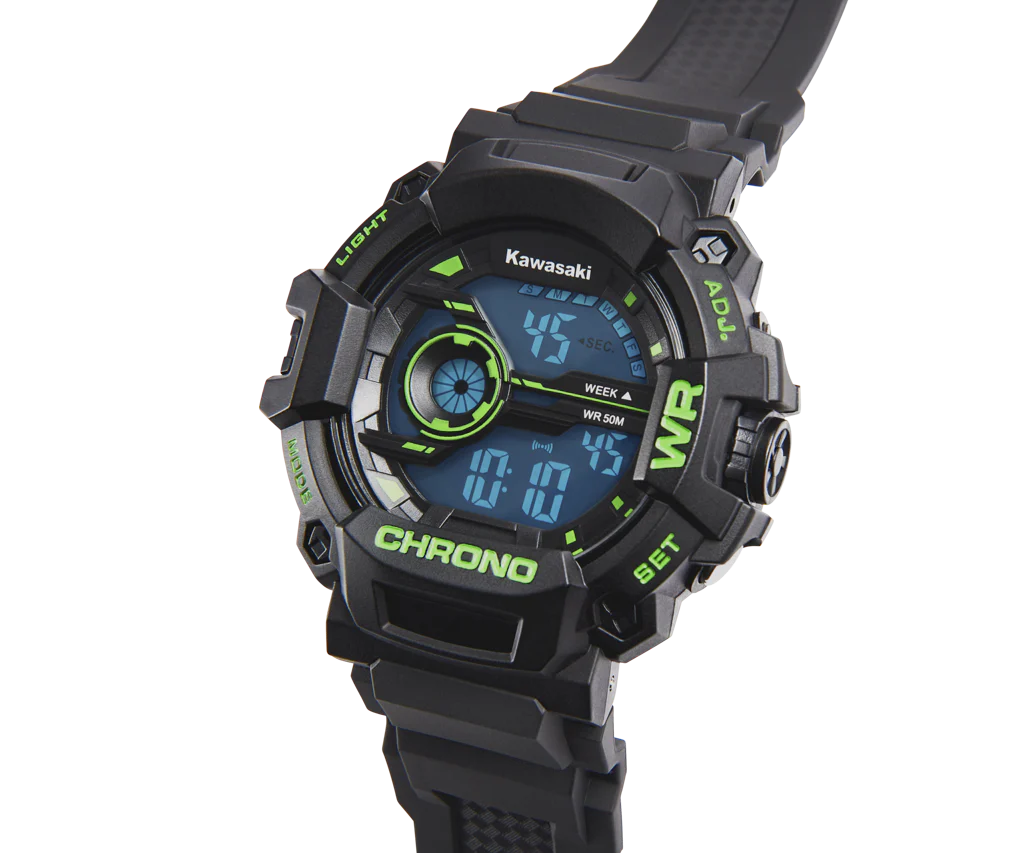This Kawasaki Sports watch, much like the Kawasaki sports bikes, is built to never miss a beat. The alarm function gets you up and rolling while the digital stopwatch is set to capture that time attack.