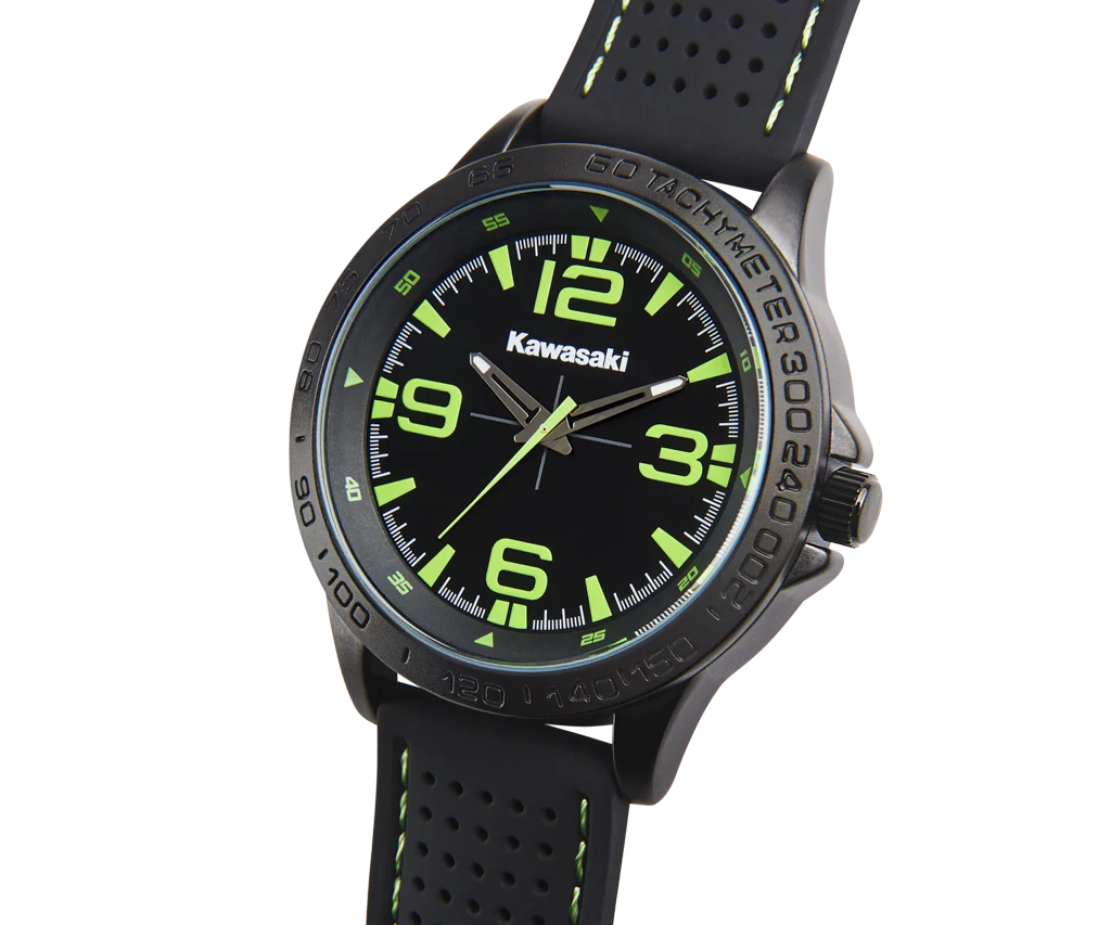 Classic time-keeping from Kawasaki with this analog watch. The stainless steel, black plated case is water-resistant to 5ATM and Japanese quartz movement means youâll never miss a beat. Rubber strap, steel buckle.